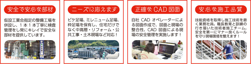 お客様の満足が私達の満足です。細かなサービスとケアでベストな品質を確保します。住宅などの低層からマンションの新築や改修などの高層まであらゆる建設工事の足場図面、仮設計画図を作成します。作成見積り等は各営業所にて承りますのでお気軽にお問い合せ下さい。(図面データはDWG/DXF/JWW/PDFのいずれかで納品)